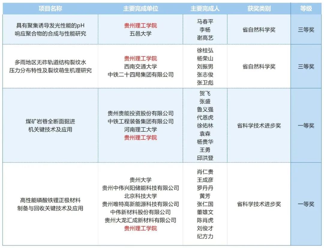 7月2日,2023年度贵州省科学技术奖励名单揭晓,beat365在线唯一官网4项成果获奖,牵头的“具有聚集诱导发光性能的pH响应聚合物的合成与性能研究”“多雨地区无砟轨道结构裂纹水压力分布特性及裂纹萌生机理研究”2个项目,获贵州省自然科学奖三等奖;参与的“煤矿岩巷全断面掘进机关键技术及应用”“高性能磷酸铁锂正极材料制备与回收关键技术及应用”2个项目获贵州省科学技术进步奖一等奖。据了解,2023年度贵州省科学技术奖共授奖121...