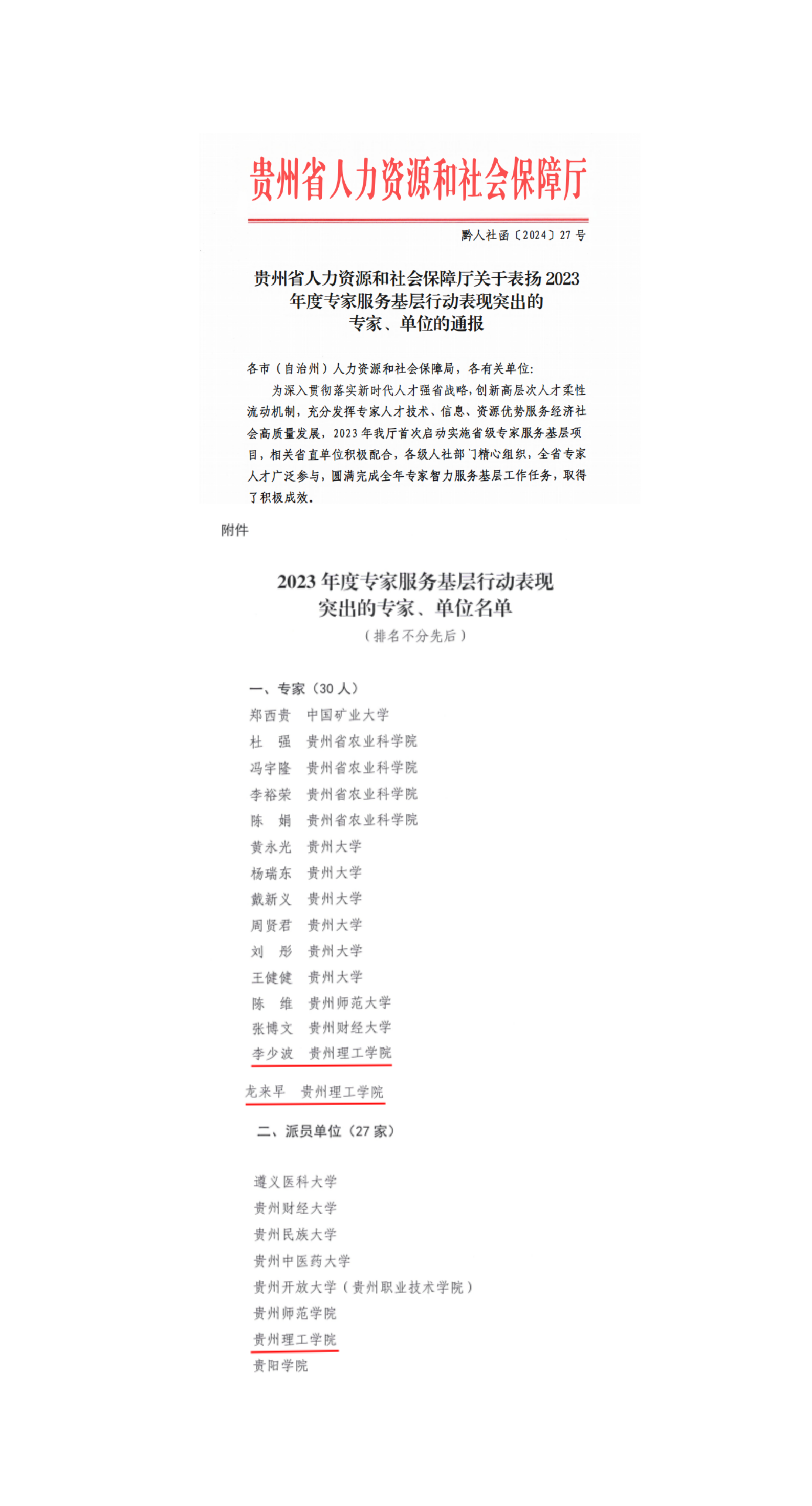 近日,贵州省人力资源和社会保障厅发布《关于表扬2023年度专家服务基层行动表现突出的专家、单位的通报》(黔人社函[2024]27号),beat365官网荣获2023年度专家服务基层行动表现突出单位,李少波、龙来早两位科研人员荣获2023年度“贵州省专家服务基层行动表现突出专家”荣誉称号