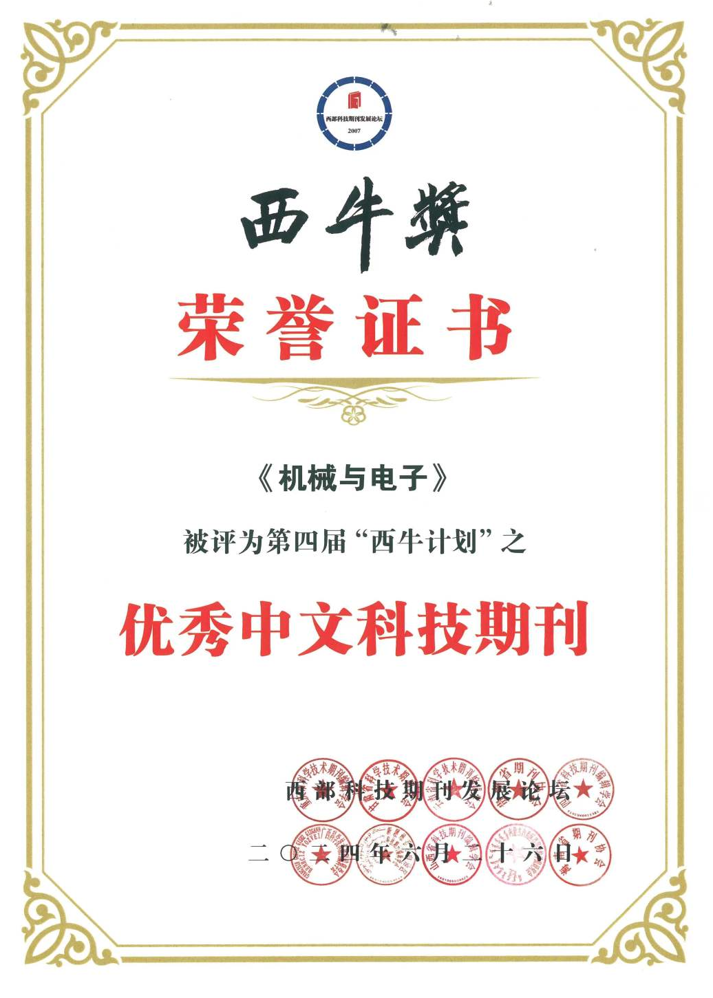 6月25-28日,由西部科技期刊发展论坛组委会主办,重庆市科学技术期刊编辑学会、甘肃省科学技术期刊学会联合承办的“第11届西部科技期刊发展论坛”在甘肃敦煌召开。西部科技期刊发展论坛组委会揭晓了2024年度“西牛奖”获奖名单,beat365官网学报编辑部《机械与电子》期刊从西部十二省、市、自治区的849种科技期刊中脱颖而出,被评为第四届“西牛计划”之优秀中文科技期刊。《机械与电子》是面向国内外发行的全国性期刊。致力于贯彻党和...