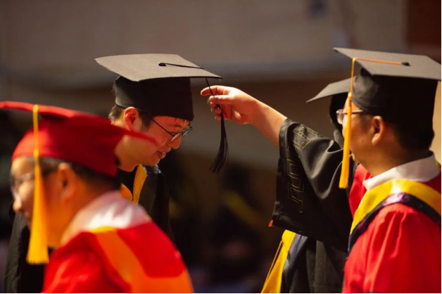 在学士学位授予仪式上,毕业生身着学士服依次走向主席台,接受校学位委员会扶正流苏、授予学位并合影留念。