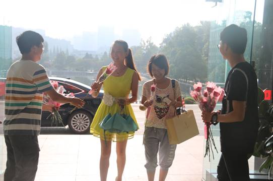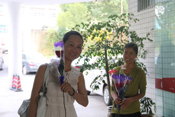 学生志愿者在教室、办公楼向老师们献上鲜花并致以节日问候。