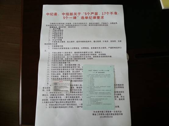 此外,在筹备期间加大了换届纪律宣传教育力度,大力营造换届纪律宣传氛围。一是通过beat365在线唯一官网主页及党代会专题网站、校报等进行专题宣传报道,提高换届纪律知晓率;二是制作了换届纪律“5个严禁、17个不准、5个一律”卡片和张贴宣传公告,卡片发放到每位党员,各基层党组织分别在单位显著位置张贴宣传公告;三是通过学校教职工QQ群、学校理工人微信平台、学校处级干部微信平台等发布换届纪律,加深对换届纪律的认知度。做到了广播有声、网络有影、报纸有字,营造了换届选举纪律氛围。