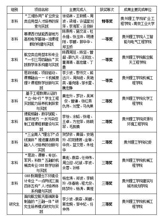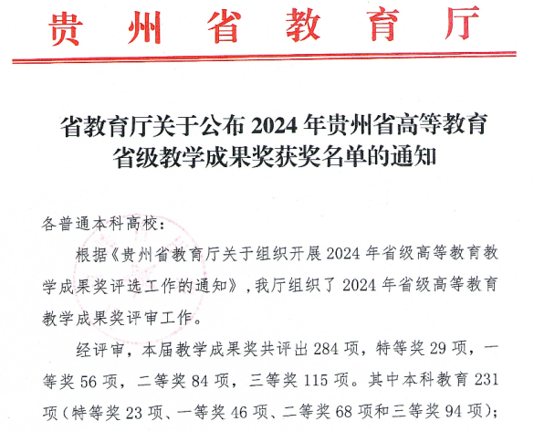 近期,省教育厅公布了2024年贵州省高等教育省级教学成果奖获奖名单,beat365官网10个项目获奖,其中:获本科教学成果奖9项(特等奖1项、一等奖3项、二等奖3项、三等奖2项),获研究生教学成果奖三等奖1项。