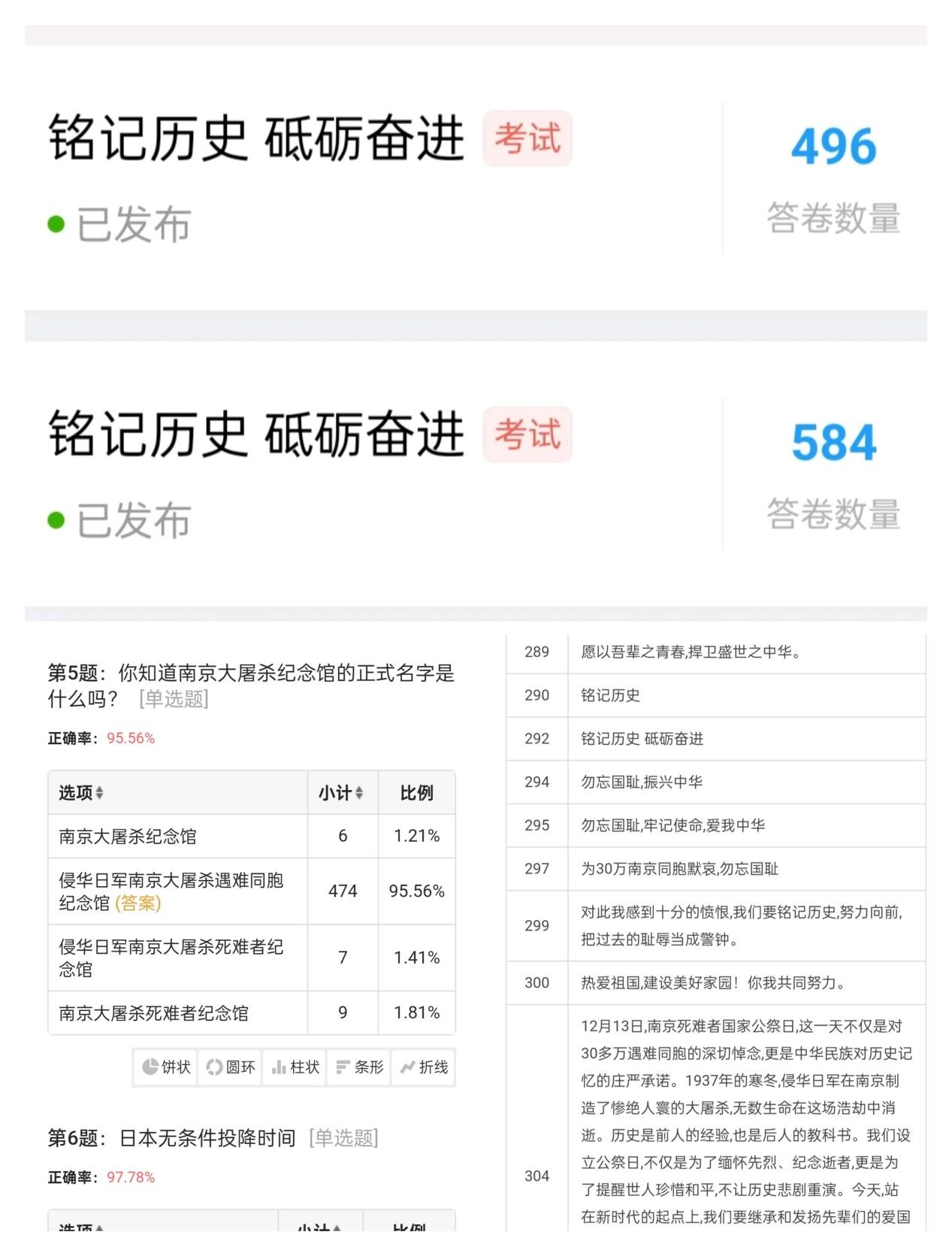 组织线上知识答题,号召同学们积极参加答题自测,加强对国家公祭日和中国抗日战争历史知识的学习。本次知识答题参与者为学院全体在校师生,及格率为100%,优秀率为92.9%,同学们还纷纷留言,发出了吾辈当不忘国耻、砥砺前行的呼声。