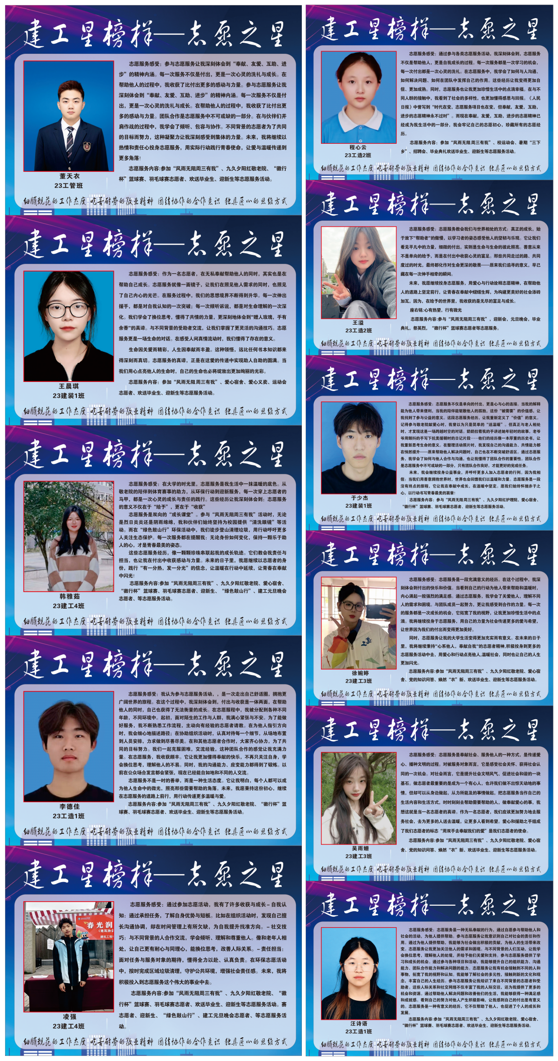 此次“建工星榜样—志愿之星”评选活动是学院推动志愿服务工作常态化、品牌化发展的重要举措。未来,学院将持续深化志愿服务体系建设,进一步完善激励机制,为学生参与志愿服务创造更好条件,鼓励更多学子践行志愿精神,以实际行动为社会发展贡献青春力量,让志愿服务的温暖之光在校园内外持续闪耀。(供稿:昌逸文 初审:施芳芳 审核:丁怡琴)