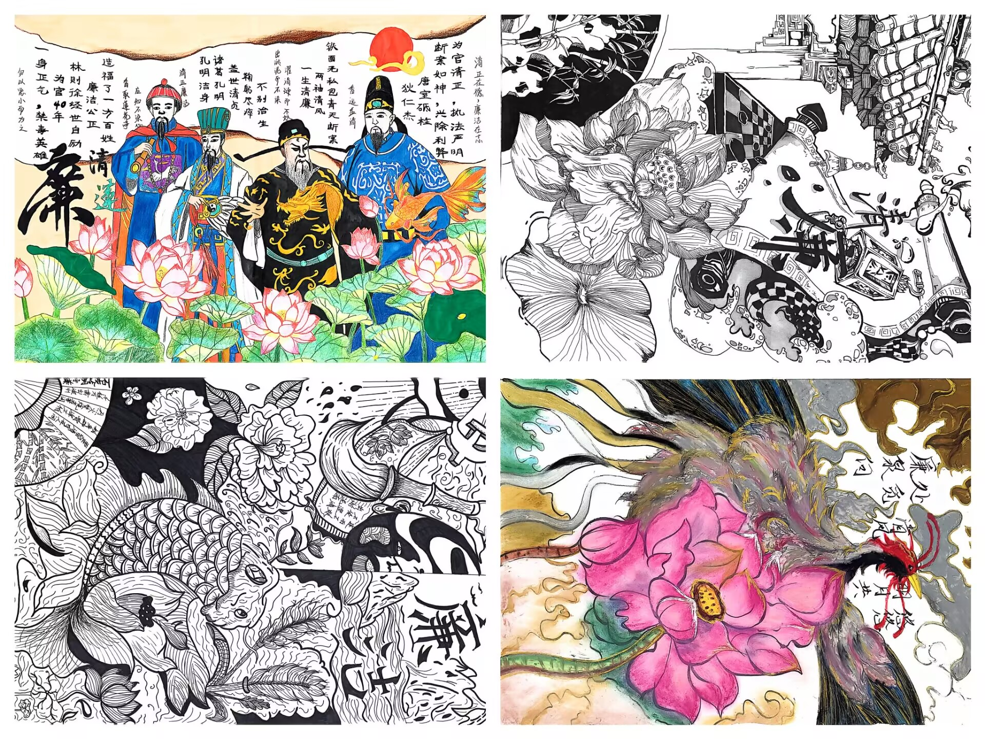 33份作品中,每一份都饱含创作者对主题的深刻理解,手绘作品亮点纷呈、意蕴深远:有的以水彩笔触勾勒出亭亭玉立的莲花,或衬以清水、山石,借“出淤泥而不染”的经典意象,隐喻廉洁自律的高尚品格;有的细致刻画包拯、海瑞等古代清官画像,人物神情坚毅、正气凛然,通过再现历史名人的廉洁事迹,传递跨越时空的清廉力量。软硬笔书法作品同样笔力遒劲,“清风劲节”“廉以修身”“匠心守廉”等字句在墨香中传递着浩然正气,与手绘作品相映成趣。
