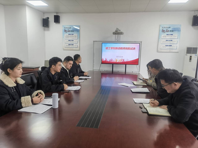 五位新进教师依次登台试讲,各展所长:张仲一老师的试讲理论系统性强、专业功底深厚;张鸿翔老师聚焦建筑施工图识读片段,内容贴近实际且知识传递准确;张杰老师围绕建筑工程职业健康安全与环境管理展开讲解,内容深刻引人警醒;刘宁涛老师讲授《建筑力学》中“平面体系几何组成分析”,逻辑清晰、专业知识扎实;潘昊瑜老师介绍Sketchup软件功能与优势,展现了良好的专业基础和教学热情。