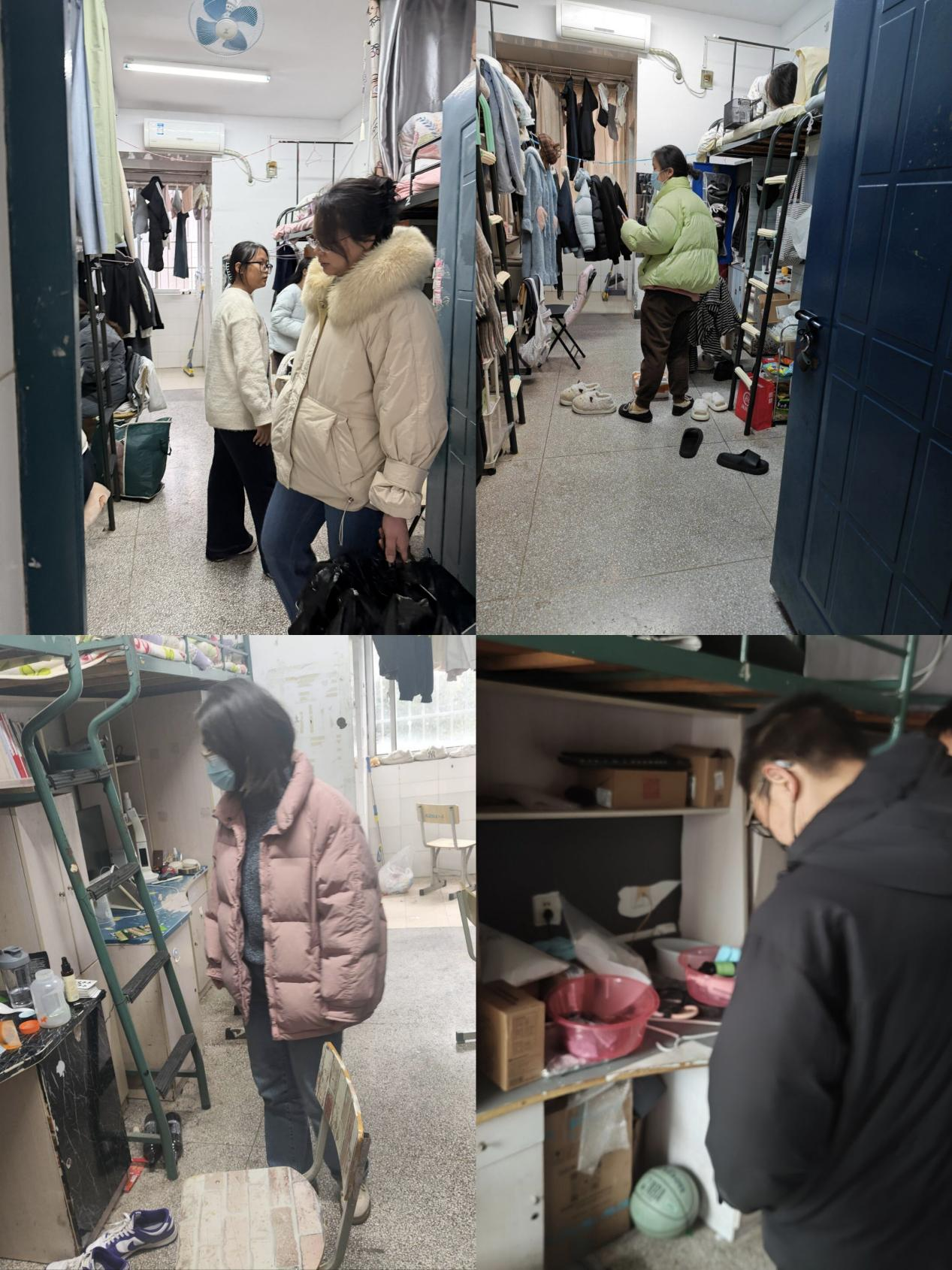 此次检查面向学生公寓2号楼和6号楼,全面排查学生宿舍可能潜在的安全风险,力求做到预防为主、防范有效。检查人员重点检查了违规电器使用、用电安全、消防设施、物品堆放及宿舍整体卫生状况等,并向学生们普及了宿舍用电管理规定和消防安全知识,并警示他们临近元旦和期末,电信诈骗和兼职陷阱频发,务必提高警惕小心提防。针对检查中发现部分宿舍存在卫生盲区、物品摆放混乱、违规使用大功率电器等问题,老师们现场指导整改,要求相关宿舍及时完成整改任务,强调遵守用电规定的重要性,严禁使用大功率电器,以确保宿舍用电安全,做到防微杜渐,增强安全意识,养成良好的生活习惯。