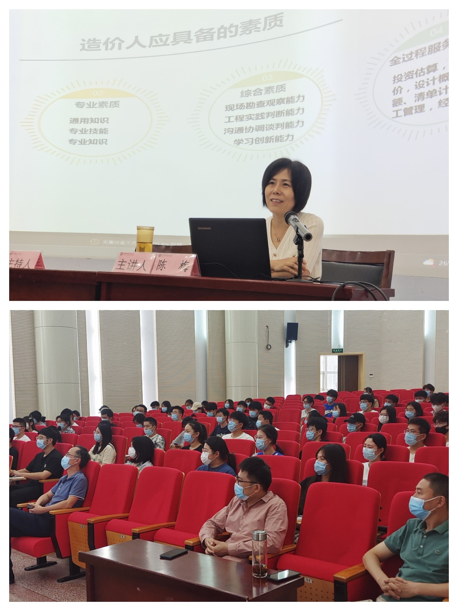 陈梅首先介绍了造价行业发展的历程和现状,随后重点谈到了造价人应具备的素养,倡导同学们从职业道德素质、专业素质、综合素质等三个方面着力学习提升。掌握知识技能,锻造道德品质,培养实践能力。分享了对造价行业未来发展前景的展望,并从职业规划和就业方向两个方面给同学们指明了方向。