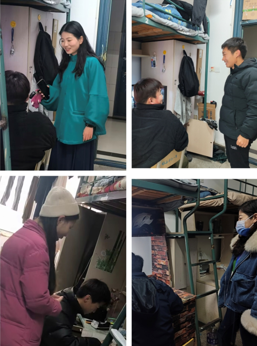 “寒假在家过好了嘛”、“辅导员,这是我们家乡的特产,你尝尝”、“这几天气温低,记得多穿点”,一间间宿舍,一句句笑语,师生情谊尽显其间。