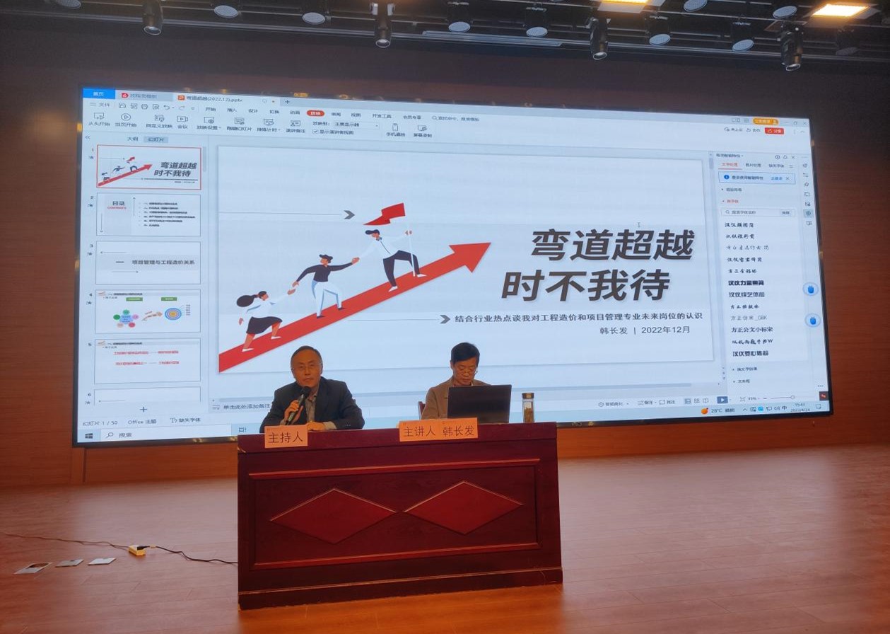 韩长发简要梳理了项目管理与工程造价关系,结合行业热点分析了工程造价和项目管理专业未来岗位的发展趋势,数智化全过程工程咨询相关内容,讲解了基于传统的DBB模式下工程造价基本概念。韩长发分析了基于行业热点下面临的机遇和挑战,并向现场学生提出了几点建议,一是基于传统业务脚踏实地练好基本功,做到学以致用;二是放开视野,在挑战的背景下积极做好跨界融合准备;三是学习与实践过程中要力争做到知其然知其所以然。