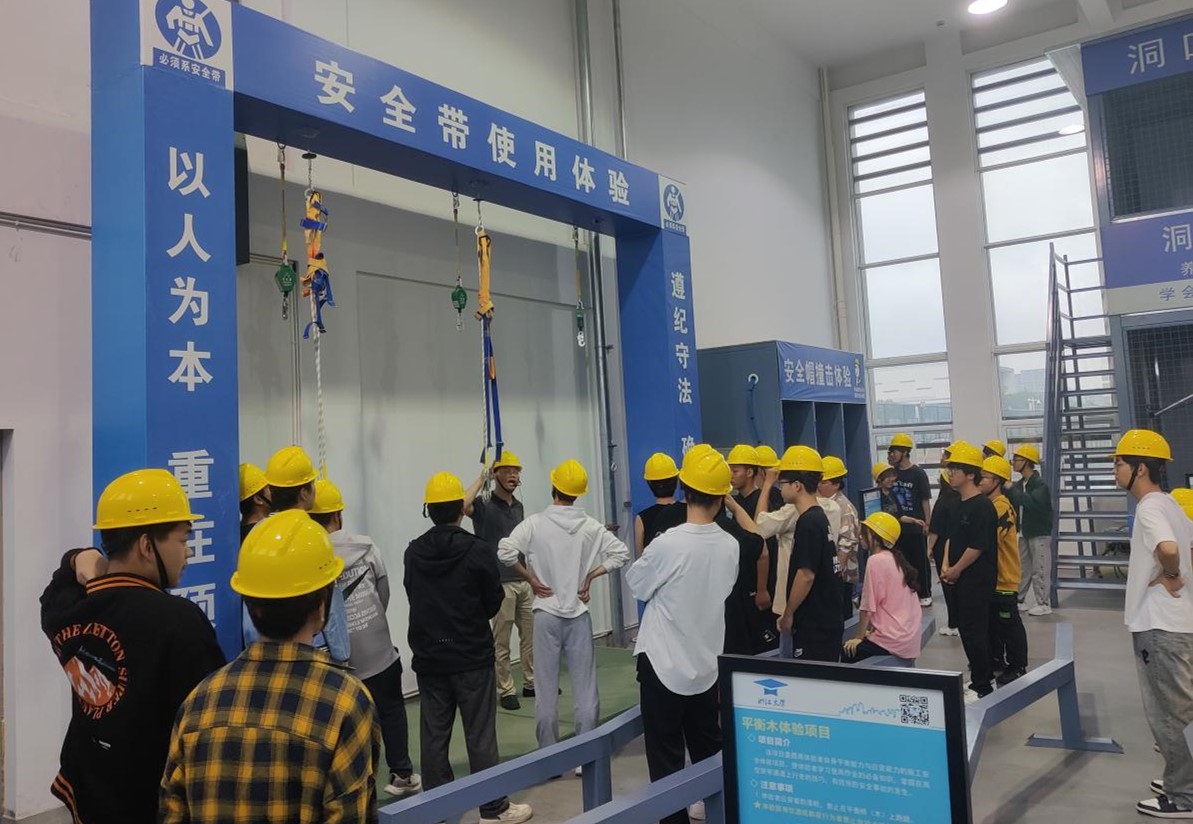 为加强2024届顶岗实习学生的安全意识,betway西汉姆联官网在科技活动周期间还组织开展了施工现场安全科普活动。建筑实训工厂作为合肥市科普教育基地创建单位,内部设有完整的施工现场安全体验设备、设施。在现场科普老师的带领下,学生进行了综合用电演示体验、安全帽撞击体验、安全带使用体验、洞口坠落体验、护栏推到体验等。同学们在体验中真切感受到施工现场安全容不得半点马虎,必须要严格按照施工标准、规范要求操作。