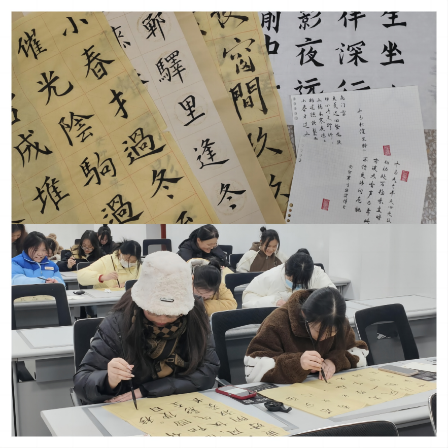 同学们轻轻铺开纸张,吸满墨汁,屏气凝神的书写每一个字,有潇洒的行书,有娟秀的楷书,还有簪花小字,一笔一画都表达着迎接冬至的愉悦。