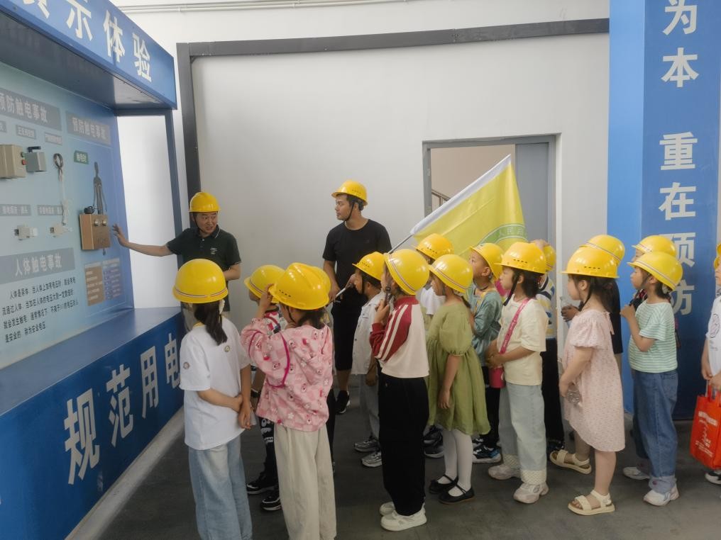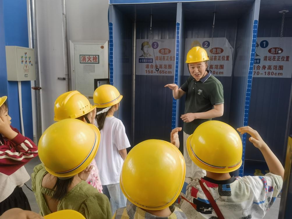 建筑实训工厂作为合肥市科普教育基地创建单位,内部设有完整的施工现场安全体验设备、设施。在黄军福的带领下,学生进行了综合用电演示体验、安全帽撞击体验、安全带使用体验、洞口坠落体验、护栏推倒体验等。学生们在体验中掌握了安全用电原则,强化了佩戴防护装备的意识,学会了正确系挂安全带,警醒了临边防护注意事项。
