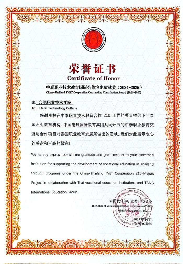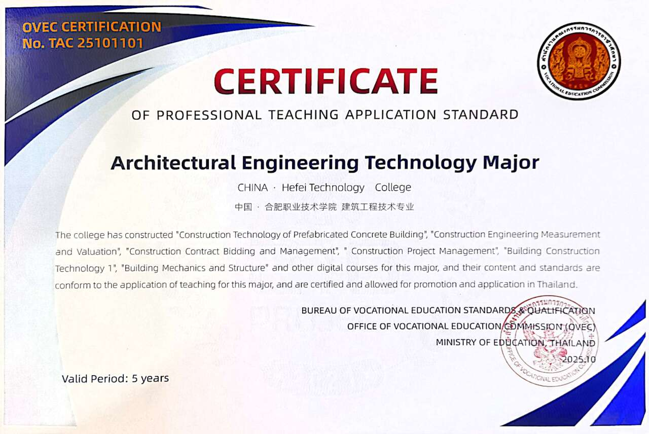 学校参加了主题为“产教融合 共建共享:推动职教出海高质量可持续发展论坛”,并领取了由泰国教育部职业教育委员会合作部部长塔纳帕·桑俊先生颁发的建筑工程技术专业的专业认证证书、三门课程的认证证书和2024-2025中泰职业技术教育国际合作突出贡献奖。