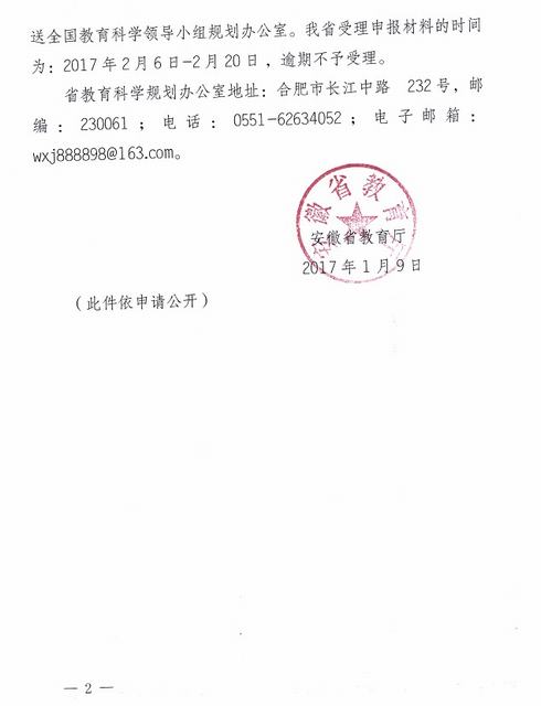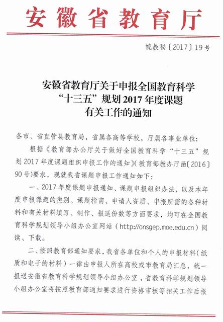 附件:《安徽省教育厅关于申报全国教育科学“十三五”规划2017年度课题有关工作的通知》