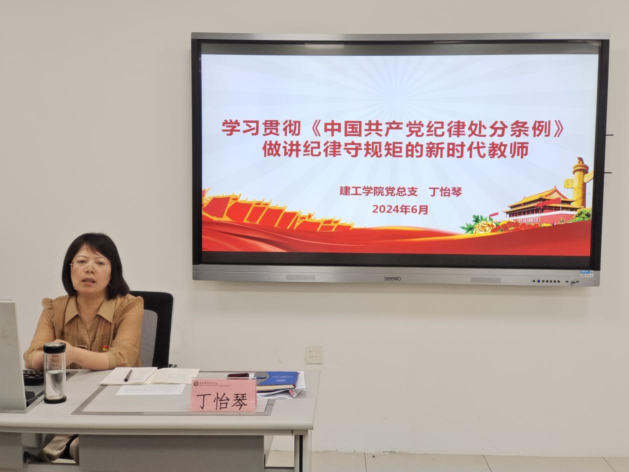 6月26日下午,学院党总支副书记(主持工作)丁怡琴以《学习贯彻<中国共产党纪律处分条例> 做讲纪律守规矩的新时代教师》为题,为全院所有教师党员作党纪学习教育专题党课。