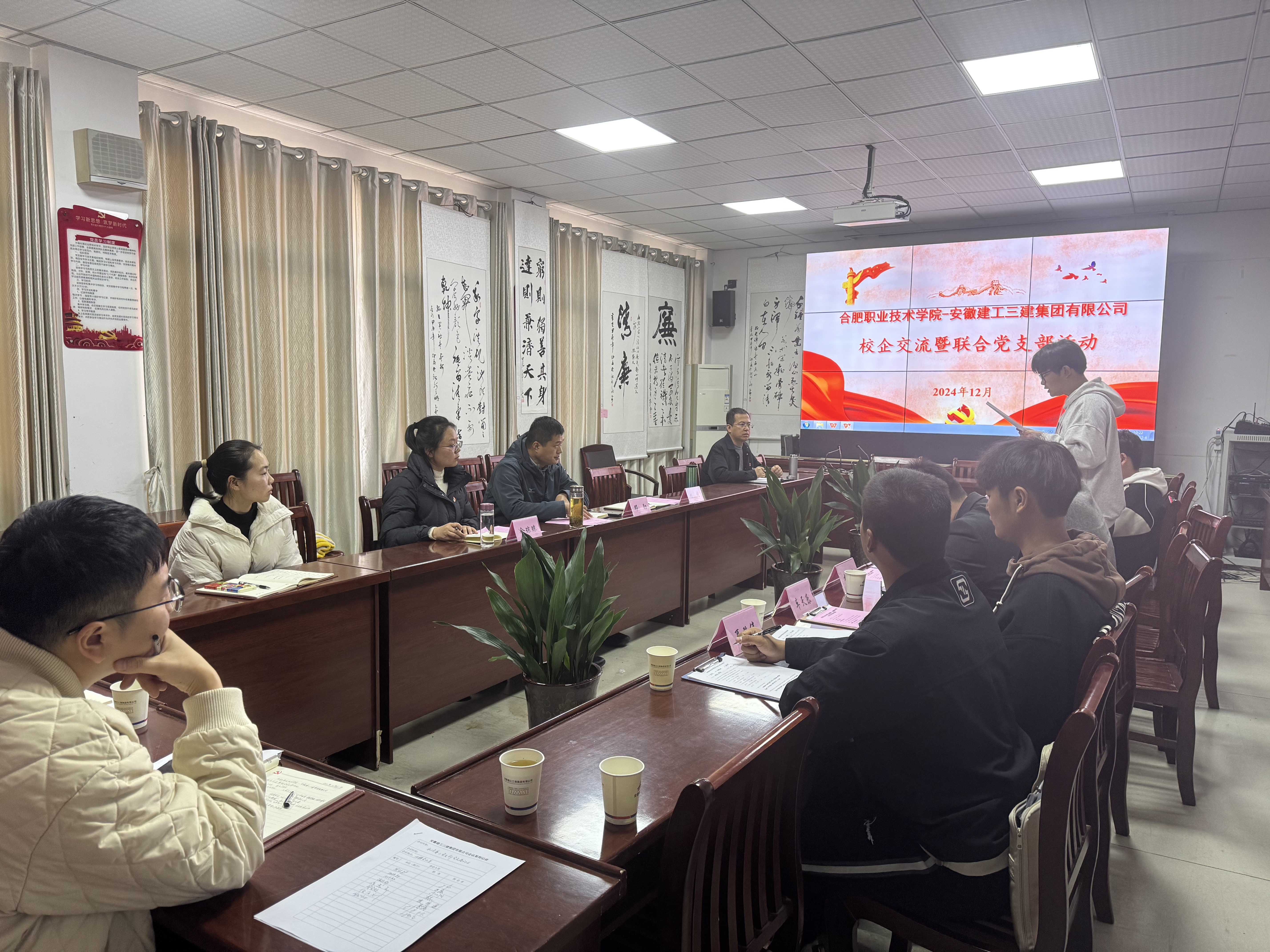 为进一步贯彻落实党的二十届三中全会和习近平总书记在安徽考察时的重要讲话精神,充分发挥党建引领校企协同育人作用,12月6日上午,betway西汉姆联官网党总支委员、副院长邓勋,第五党支部书记金琼琼,综合办主任杨靖一行到安徽建工三建集团有限公司开展联合党支部活动。本次活动受到三建集团有限公司党委组织部、数字信息部与机关第二党支部等相关部门的大力支持。