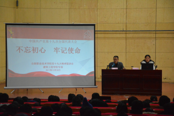按照学校要求,本次讲座主要有五个部分内容:第一部分为党的十九大概况;第二部分为十九大报告重点内容解读;第三部分为青年兴则国家兴,青年强则国家强;第四部分为砥砺奋进的合职;第五部分为稳中求进的合职建工。