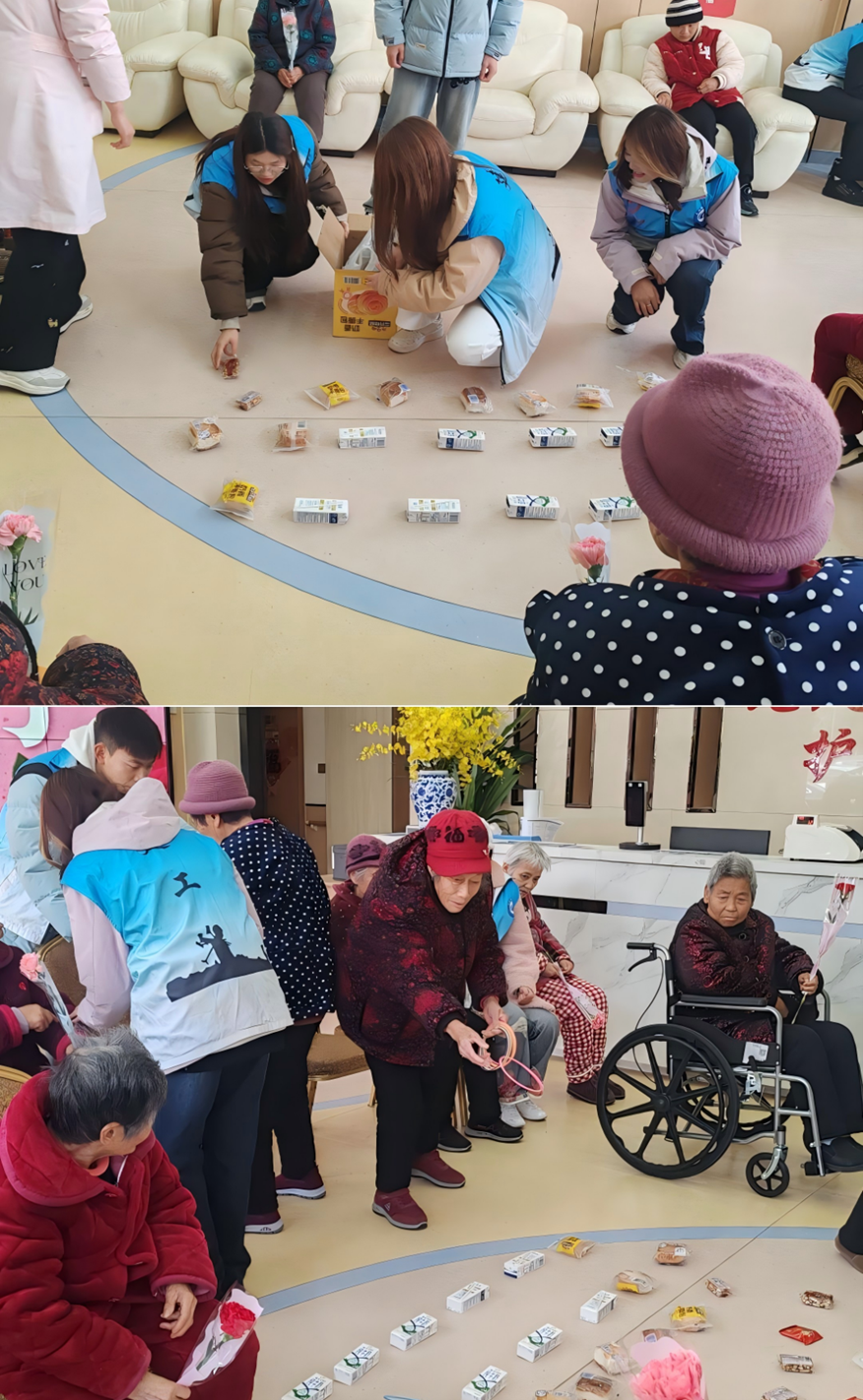 正值三八国际劳动妇女节,志愿者们向老人们送上鲜花,陪伴老人进行了套圈小游戏,志愿者们用真诚的微笑和耐心的陪伴,让老人们在这个特别的日子里感受到温暖快乐。