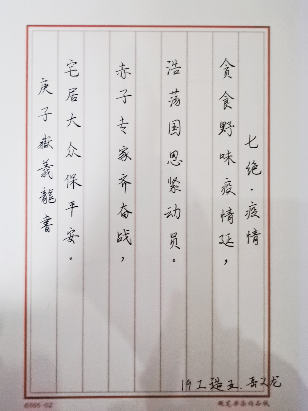 我以我手书我心”,一幅幅或苍劲有力或雄健洒脱或工整秀丽的书法作品表达了同学们对抗疫战斗必胜的决心和抗疫英雄的崇敬。