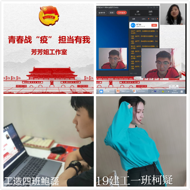 5月4日上午10点,“芳芳姐工作室”组织我院优秀团员代表以钉钉直播的方式开展了“青春战疫担当有我”主题团日活动,活动由施芳芳老师主持。直播在《中国青年值得托付》的歌声中拉开了序幕,施老师首先带领大家逐字逐句学习了习总书记在五四青年节给全国各族青年的祝福和寄语,回顾了近年来习总书记多次以多演讲、座谈、回信等方式对青年说的话。随后是抗疫志愿者故事分享环节,来自我院19建工3班的那飞跃和19建工5班的刘宏亮两名同学通过连麦和同学们分享了他们在担任家乡抗疫志愿者工作时的故事和感悟。他们的发言质朴、诚恳,生动的再现担任志愿者时发生的一些小故事,也让与会同学深受感动。是的,我们都是普通青年,但当祖国需要我们的时候,我们就会毫不迟疑的站出来,护家乡,保国家。最后,施老师带领大家一起重温入团誓词,活动圆满落幕。