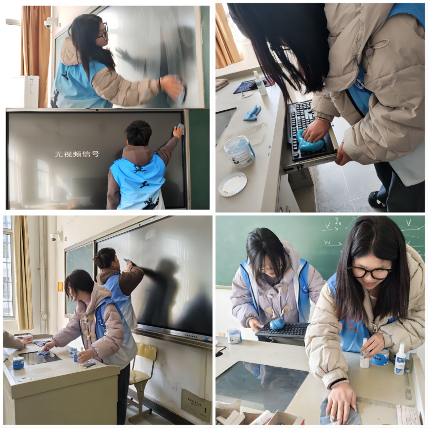 为了确保开学第一天教学活动的有序进行,让师生有个洁净、愉悦的教学环境,3月3日,在新学期开始的前一天,“建小志”们细心的带来专用清洁工具,分工明确、相互配合,对教学C楼所有代管教室的电脑屏幕和键盘进行了全方位的清扫,不留尘埃,开启明亮新学期。