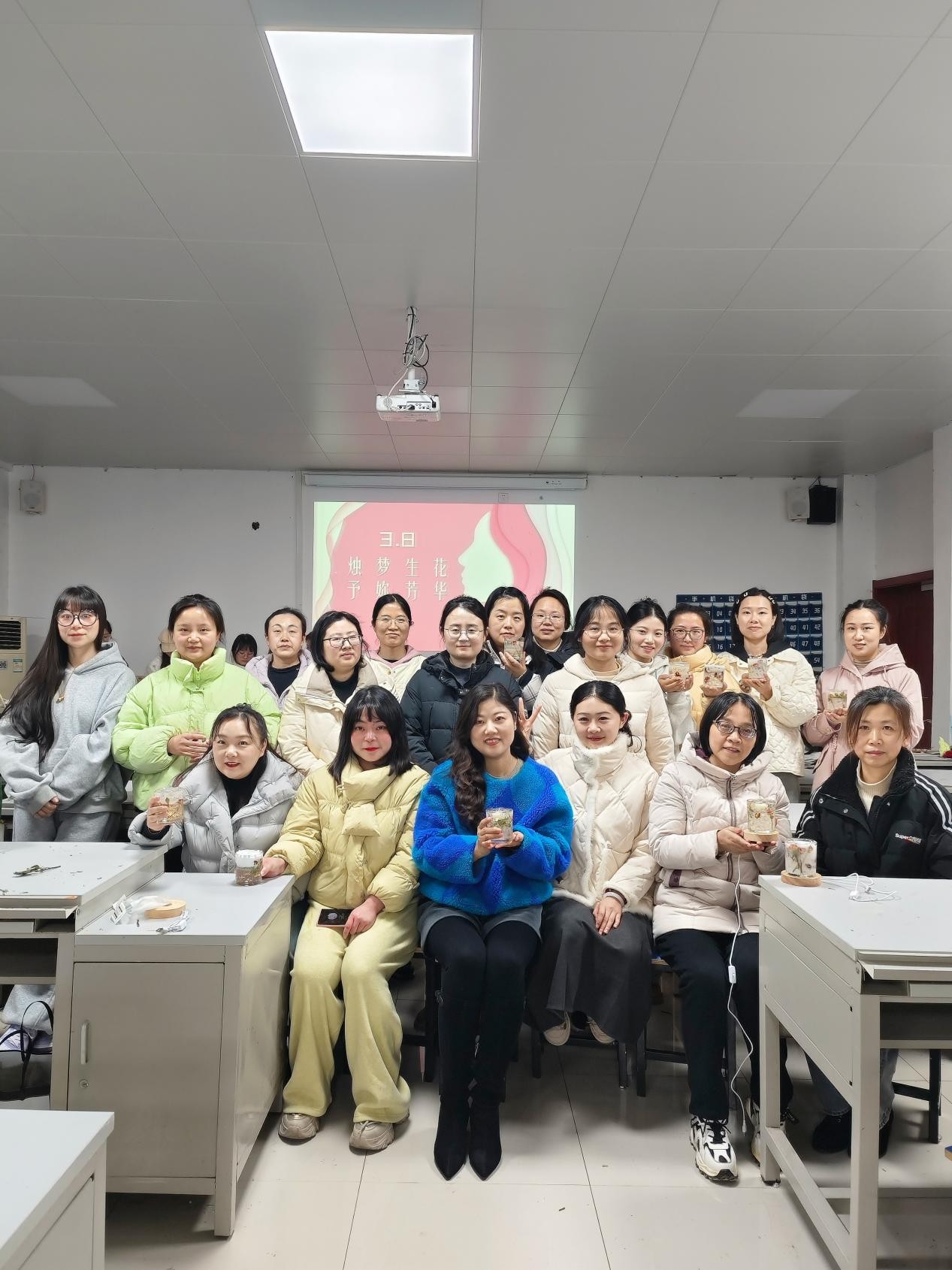 经过一个多小时的努力,一个个精美的水晶香薰蜡烛呈现在大家眼前。它们或流光溢彩,或清新夺目,每一盏都凝聚着老师们的心血与创意,每一盏都散发着独特的光芒与芬芳。活动最后,大家手持自己的作品合影留念,记录下这美好的瞬间。