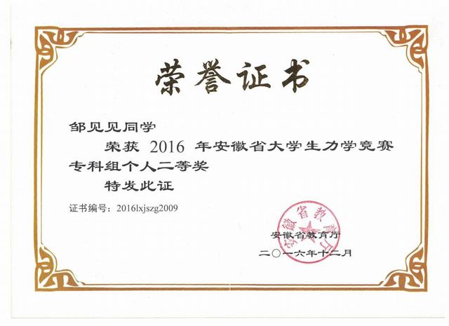 2016年安徽大学生力学竞赛二等奖获得者——2015级工程造价2班邹见见同学