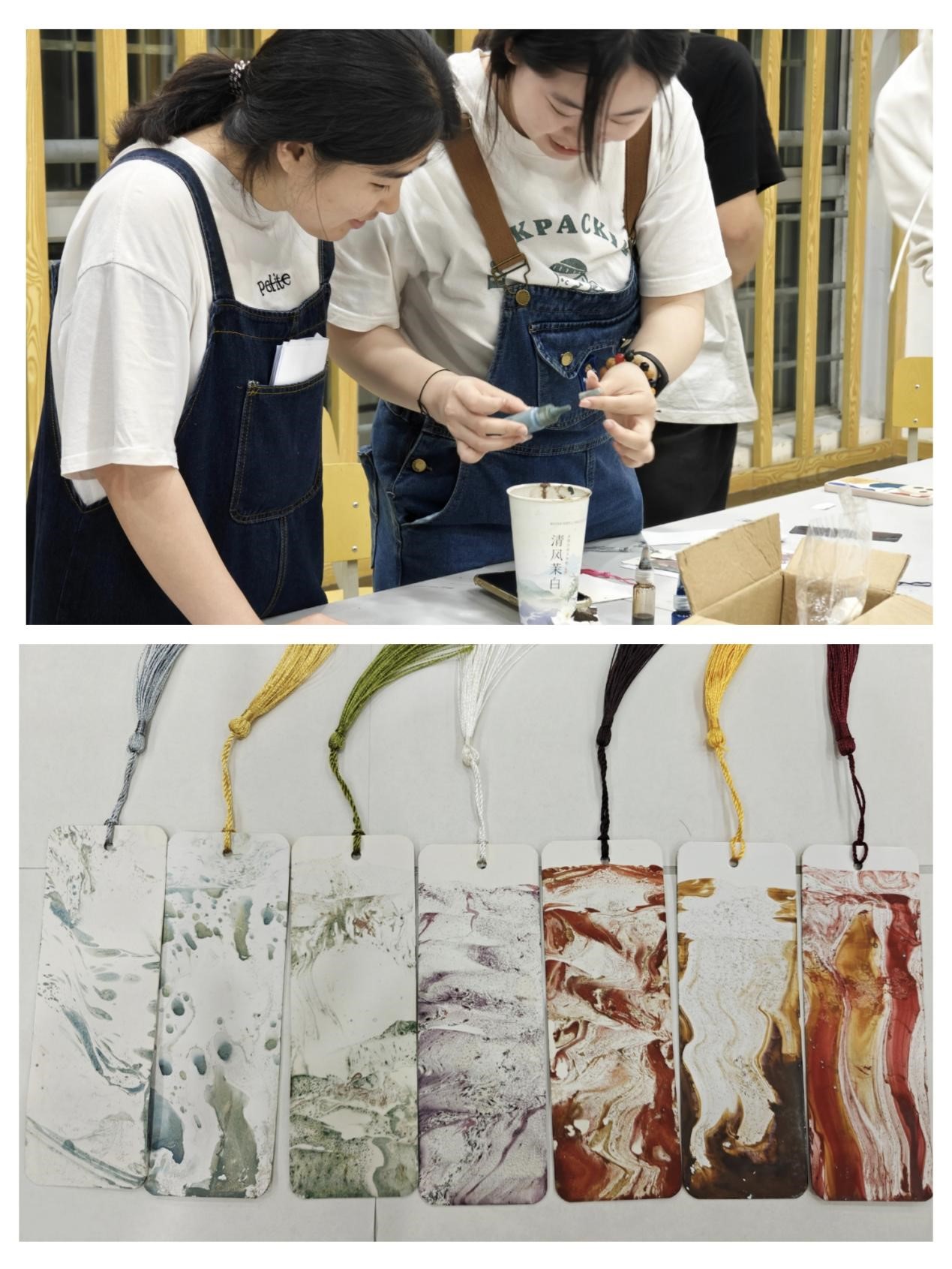 分享会后,同学们还制作了专属自己的漂漆书签。漂漆是流动的艺术,漆漂在水面上,形成发散的形状,极具生命感和随机性,一吹、一搅,配合滑动的技巧,各种颜色穿插与交织,看见了水因“势”而走的痕迹。同学们用各种手法在水面上勾勒出自己的艺术世界,当书签轻轻插入水中,吸附起那些色彩斑斓的漆液纹理,一件件精美的飘漆书签便呈现在眼前。此次活动不仅让同学们在阅读中感受到了书籍的魅力,而且让学生们亲身体验了传统漆艺的制作过程。学生们纷纷表示,这样的活动让他们更加热爱阅读,也让他们更加珍惜传统文化的传承和发展。