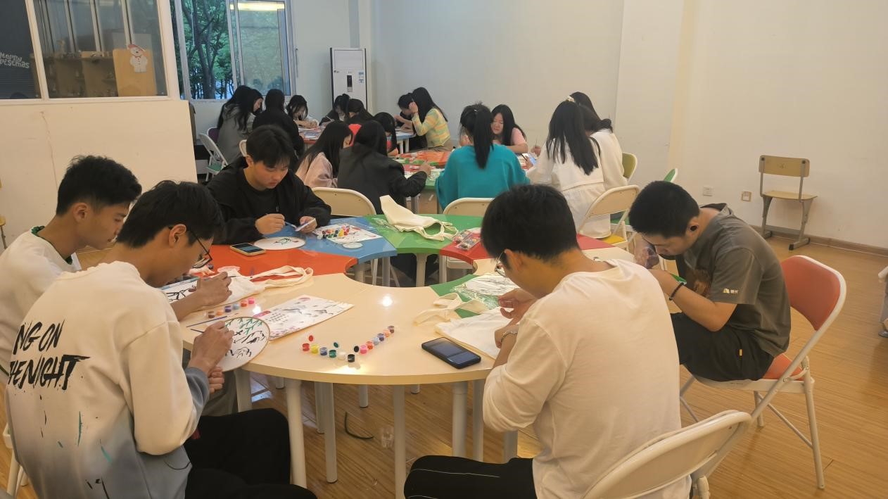 春日约绘,DIY手绘活动。学生们利用多彩的颜料,以手绘帆布包和团扇为载体,尽情地挥洒着自己的想象力和创造力。将自己的内心想法呈现在涂鸦作品中,五颜六色的花朵、惟妙惟肖的彩蝶、轻松谐趣的卡通形象,展现了青春的色彩和活力。