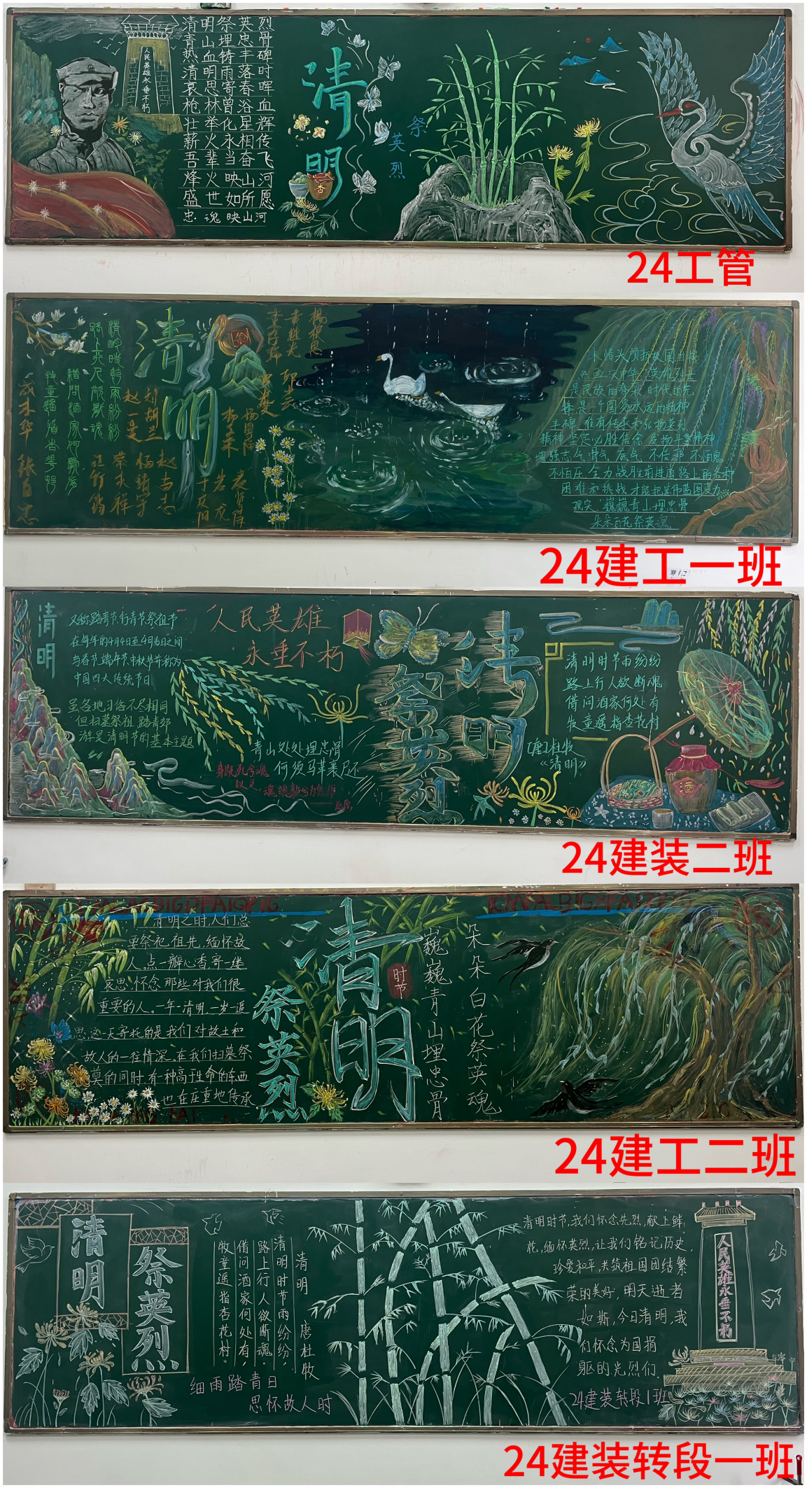 各班级的黑板报各具特色,有的以庄严肃穆的烈士陵园为背景,搭配简洁有力的文字,表达对英烈的深切哀悼;有的通过绘制革命先烈的英勇事迹画面,如长征、抗日战争等场景,生动展现了英烈们为国家独立和民族解放抛头颅、洒热血的壮丽篇章。经过评选,24环艺班等九个班级分别获得一、二、三等奖。