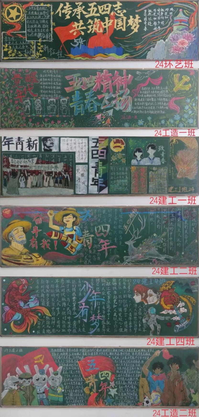 为弘扬五四精神,展现青年学子的艺术风采与创新思维,betway西汉姆联官网开展“五四筑梦行”主题板报绘制评比活动。24级15个班级积极参与,经过激烈角逐,24环艺班等6班级脱颖而出,分别斩获一二三等奖。